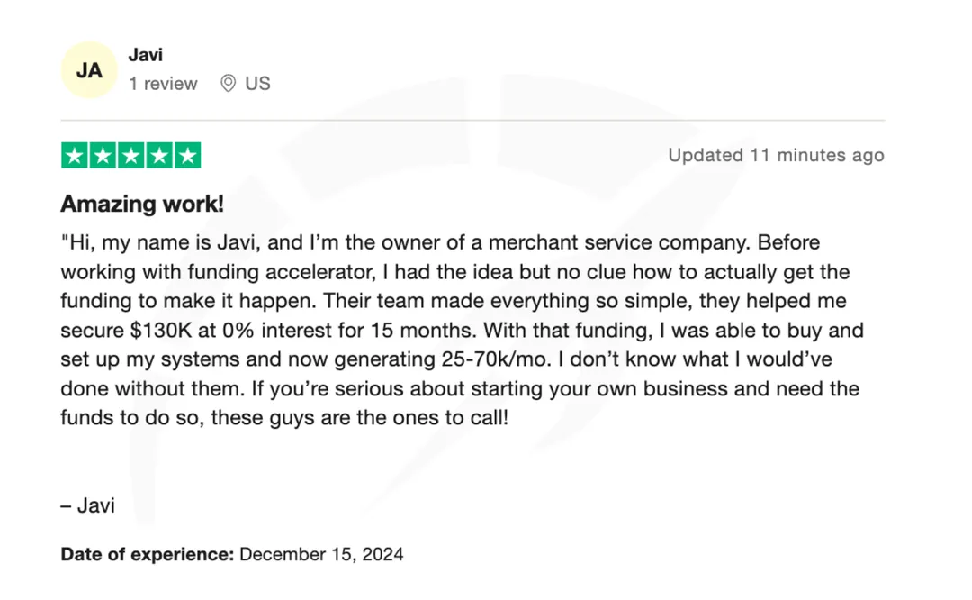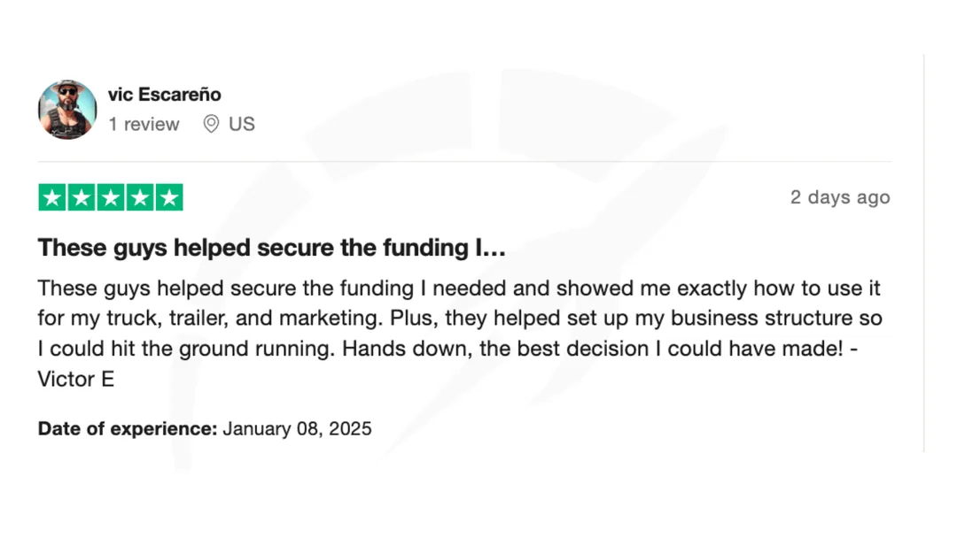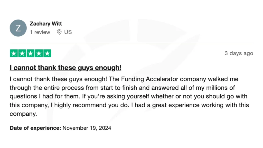 IMPORTANT: FUNDING, EARNINGS AND INCOME DISCLAIMER All testimonials on this page are from real clients. The results you see on this page are not typical. Their experiences do not guarantee similar results. Individual results may vary based on your skills, experience, motivation, as well as other unforeseen factors. The Company has yet to perform studies of the results of its typical clients. Your results may vary.